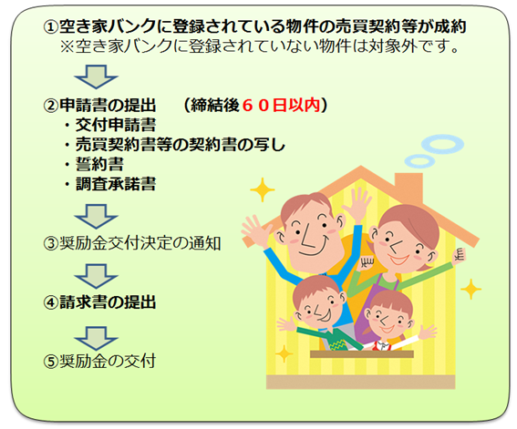 (1)空き家バンク登録者であること。 (2)利用希望者(空き家バンク制度における利用希望登録者)との間に売買契約、賃貸借契約、使用賃貸契約等を行っていること。 (3)利用希望者が登録者の3親等以内の親族でないこと。 (4)雲仙市税の未納がないこと。 (5)不動産の売買及び賃貸等を事業として行っていないこと。 (6)住宅については、個人が居住を目的として建築した家屋であること。 (5)その他、市長が必要と認めること。