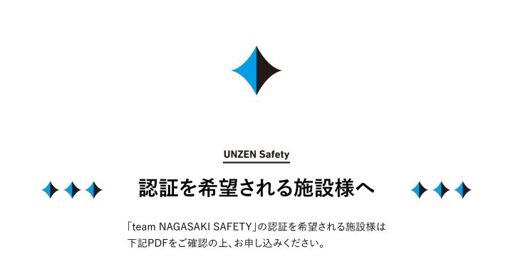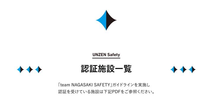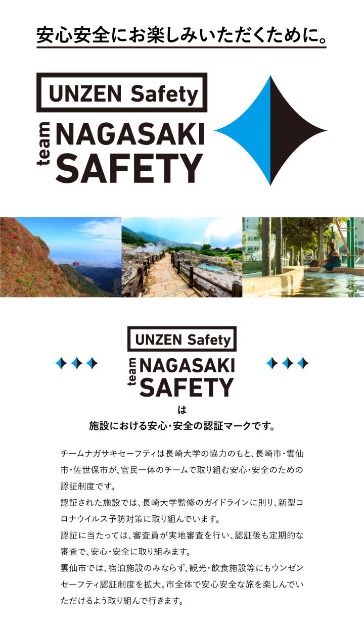 | | | 新型コロナウイルス感染症の拡大により、安心・安全の確保が重要となっています。 現在、宿泊施設の認証基準「team NAGASAKI SAFETY(チームナガサキセーフティ)」を、長崎大学、長崎市、雲仙市、佐世保市の産官学連携により設定し、共通したガイドラインによる取り組みを進めています。 雲仙市におきましては、雲仙市・(一社)雲仙温泉観光協会・小浜温泉旅館組合等で「新型コロナウイルス予防対策認定実行委員会」を立ち上げ、「UNZEN Safety(ウンゼンセーフティ)」として、宿泊客の皆様に安心・安全な宿泊を提供する取り組みを実施しています。 今後、新型コロナウイルスの終息に向けて、段階的な観光復興が見込まれるものの、観光施設等の滞在における不安や懸念は当面残るものと想定されます。 そこで、飲食店や観光施設等においても、同様な取り組みを行うことで、地域一体となった雲仙市の面的な安心安全への取り組みについて更に整備を進め、観光客に安心して訪れていただける自治体として、旅先に選ばれるきっかけの一つにしたいと考えています。