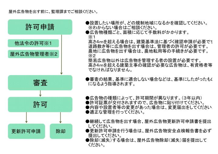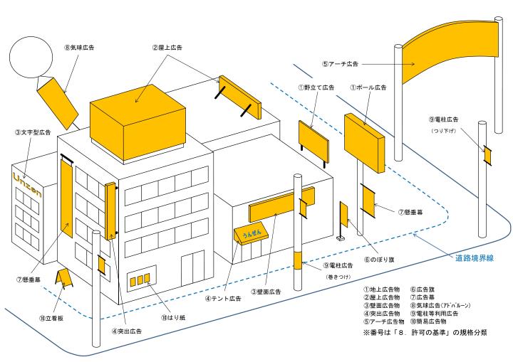許可地域で広告物を表示するためには、許可申請が必要です。 また、禁止物件、禁止地域には、広告物の設置はできません。 ただし、社会生活を営む上で最低限必要な広告物については、以下のような場合、一定の基準内に限り許可申請が不要になります。 |