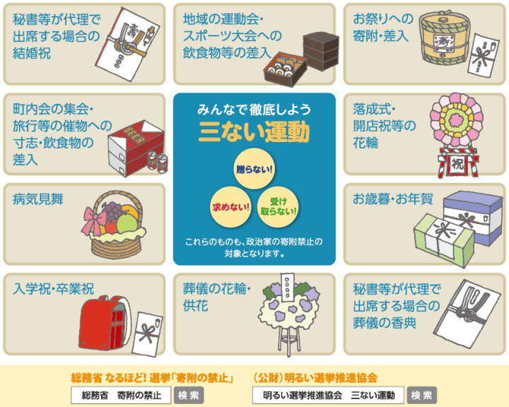 | | 1.政治家からの寄附禁止 選挙の有無に関わらず、政治家が選挙区内の人に寄附を行うことは、名義のいかんを問わず特定の場合を除いて一切禁止されています。有権者が求めてもいけません。冠婚葬祭における贈答なども寄附になるので、注意してください。