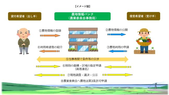 | (8)許可申請 | 所有者と利用希望者は連名で「農地法第3条許可申請書」を農業委員会へ提出してください。 |