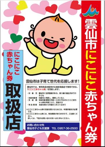 雲仙市にこにこ赤ちゃん支援事業の取扱店登録募集雲仙市にこにこ赤ちゃん支援事業(育児用品購入助成事業)の実施にあたり、にこにこ赤ちゃん券が利用できる店舗を募集します。